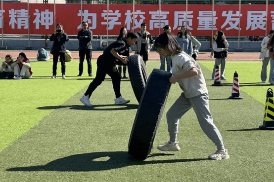 集体项目30m车轮接力赛即将开始,这不仅是一次力量与团结的大比拼,更是毅力与信念的考验。只见男子组张子豪用力抬起轮胎,一圈又一圈,草坪上留下的是努力的痕迹;女子组的段艺格也迅速找到正确的施力点,和轮胎保持相同的节奏与速度前进。每位参赛的同学都在比赛过程中投注了饱满的热情,他们耐心且专注,使推轮胎“滚”得快速且平稳,他们配合十分默契,在相互顺畅的衔接下,比赛顺利完成。