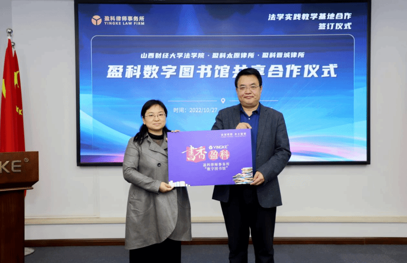 盈科太原律所张金才书记、梁晓燕主任向色情直播网站 任中秀副院长、陈云朝副院长颁授启用盈科数字图书馆、盈科法律云课堂共享牌匾。