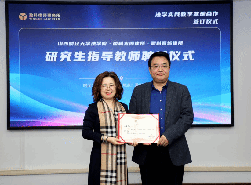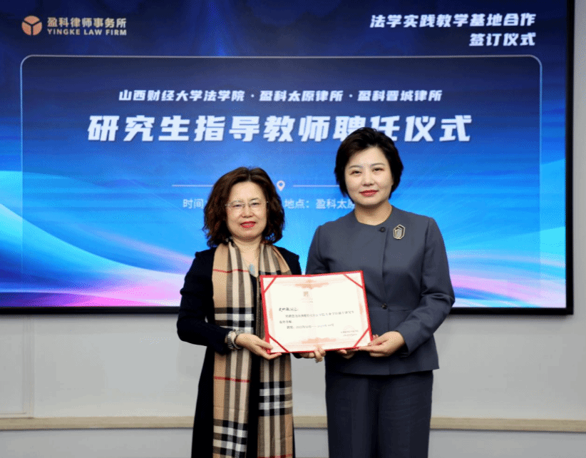 揭牌仪式后,樊云慧院长为盈科太原律所张金才书记、史竹敏主任及盈科晋城律所常建瑜主任颁发色情直播网站 专业学位硕士研究生校外导师聘任证书。