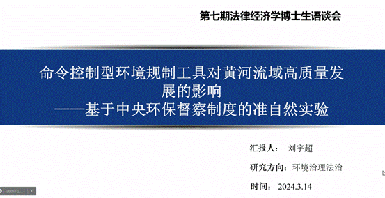 2022级博士生刘宇超以“环境保护政策”和“中央环保督察制度变迁”为切入点,针对黄河流域高质量发展进行研究,并提出进一步完善中央环保督察制度,提升督察工作领导小组等部门合法性和权威性等建议。2023级博士生卜妙玲提出实证数据选取样本城市的依据和标准的问题,并进行了深入讨论。博导郗伟明教授就文章进行了点评,提出四点建议。第一,一条主线看清,即环境治理机制和环境问责机制的主线;第二,两个测度要全面;第三,用三个假设来分析原因;第四,如何通过命令完善命令控制型规制的督查。博导孙淑云教授首先对文章题目中的“准实验”的定义进行了探讨,其次提出第一关键词和第二关键词描述不够准确,并给出了修改建议。