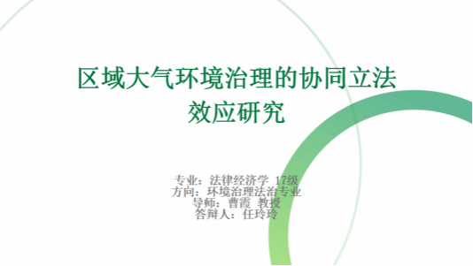 在汇报环节,任玲玲同学聚焦于区域大气环境治理的协同立法效应研究,该研究探讨了协同立法在大气污染防治层面的法律理论依据,以期推动协同立法在区域大气环境治理中的效应提升,促进区域高质量发展。她还从经济学视角切入,介绍中国大气污染现状及其区域性特点,强调区域大气污染治理的重要性,提出协同立法在区域大气环境治理中的优化建议。
