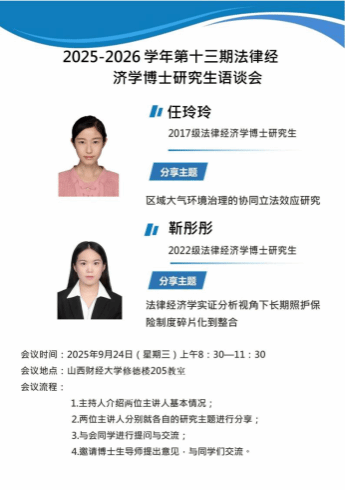 本次与谈会共分为三个环节。第一环节,两位博士生围绕其研究主题进行汇报;第二环节,郗教授对同学们的汇报内容进行逐一点评;第三环节,郗教授简要介绍了2025年法经济学论坛的筹备情况,并鼓励同学们积极投稿、踊跃参与,拓展学术视野。