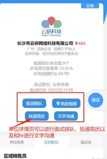 单位PC端参会。招聘会当天PC端进入招聘会会场→单位登录→选择报名场次→进入视频面试间→面试列表中选择在线求职者,点击“开始面试”→进行视频沟通。更多人才需求可提前点击“去邀约面试”进入人才大厅邀约,邀约被同意后即可面试。视频挂断后,单位给出面试结果“合格”或者“不合格”,以及相关备注,以便后续查看。